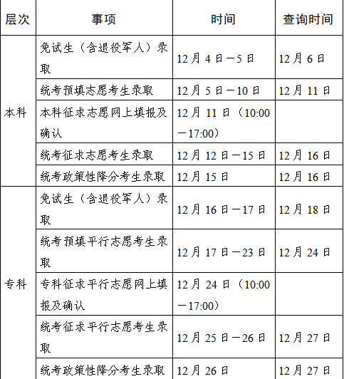 我省2025年成人高校招生录取工作将于12月4日至26日进行,现将具体日程公布如下。请考生按相应查询时间登录我院门户网站(www.jseea.cn)“查询中心”查询录取结果。