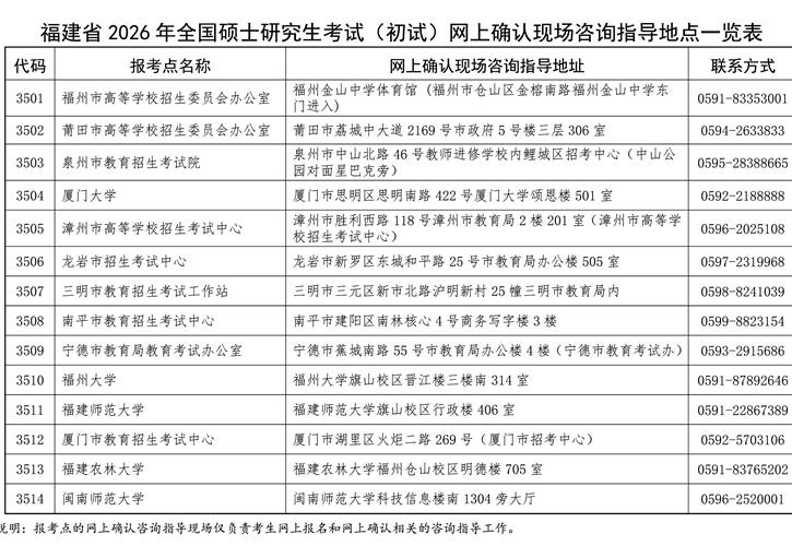 附件:福建省2026年全国硕士研究生考试(初试)网上确认现场咨询指导地点一览表