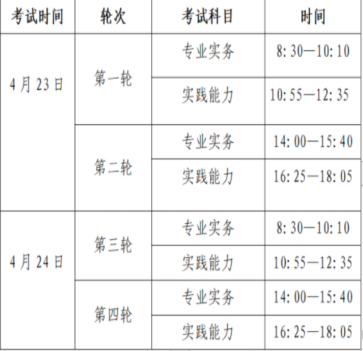 (四)考试形式及时间:2022年护士执业资格考试实行人机对话考试,定于2022年4月23日—24日举行,每半天为一个轮次,分为4轮次依次进行,考生将随机分配至其中一个轮次,参加专业实务和实践能力两个科目的考试,具体安排如下: